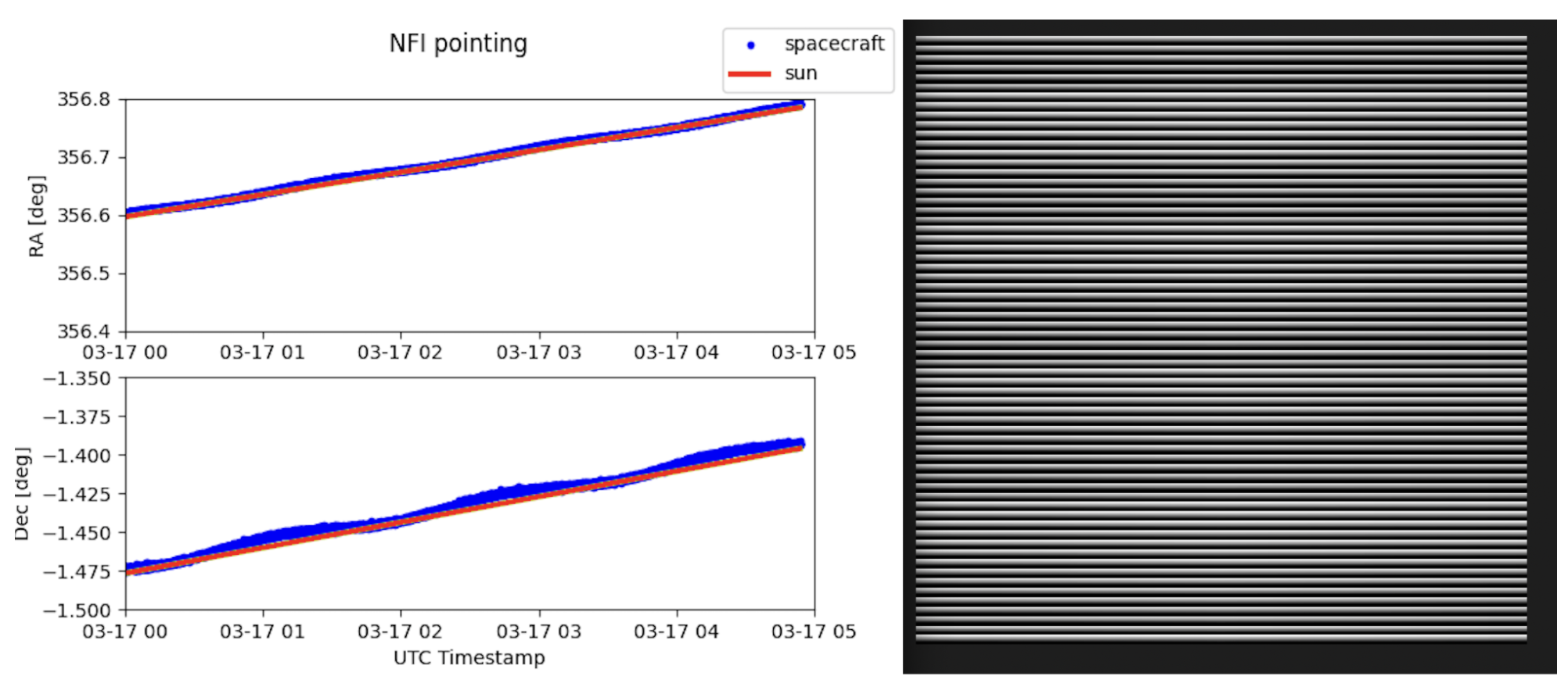 The test pattern on the right was generated on-orbit by the PUNCH/NFI camera itself, in a test mode. It was processed through the spacecraft's complete data compression system, packetized, downloaded during a ground pass, transferred from a remote antenna site to the Mission Operations Center (MOC) in SwRI's Boulder Colorado offices, checked for errors, handed to the Science Operations Center (SOC) down the hall, unpacked and reassembled, combined with "housekeeping" data collected on-board NFI at the same time, and finally merged into a single FITS file reminiscent of our final data products, with a complete set of metadata attached. It's the first data product to be processed end-to-end through all those steps.