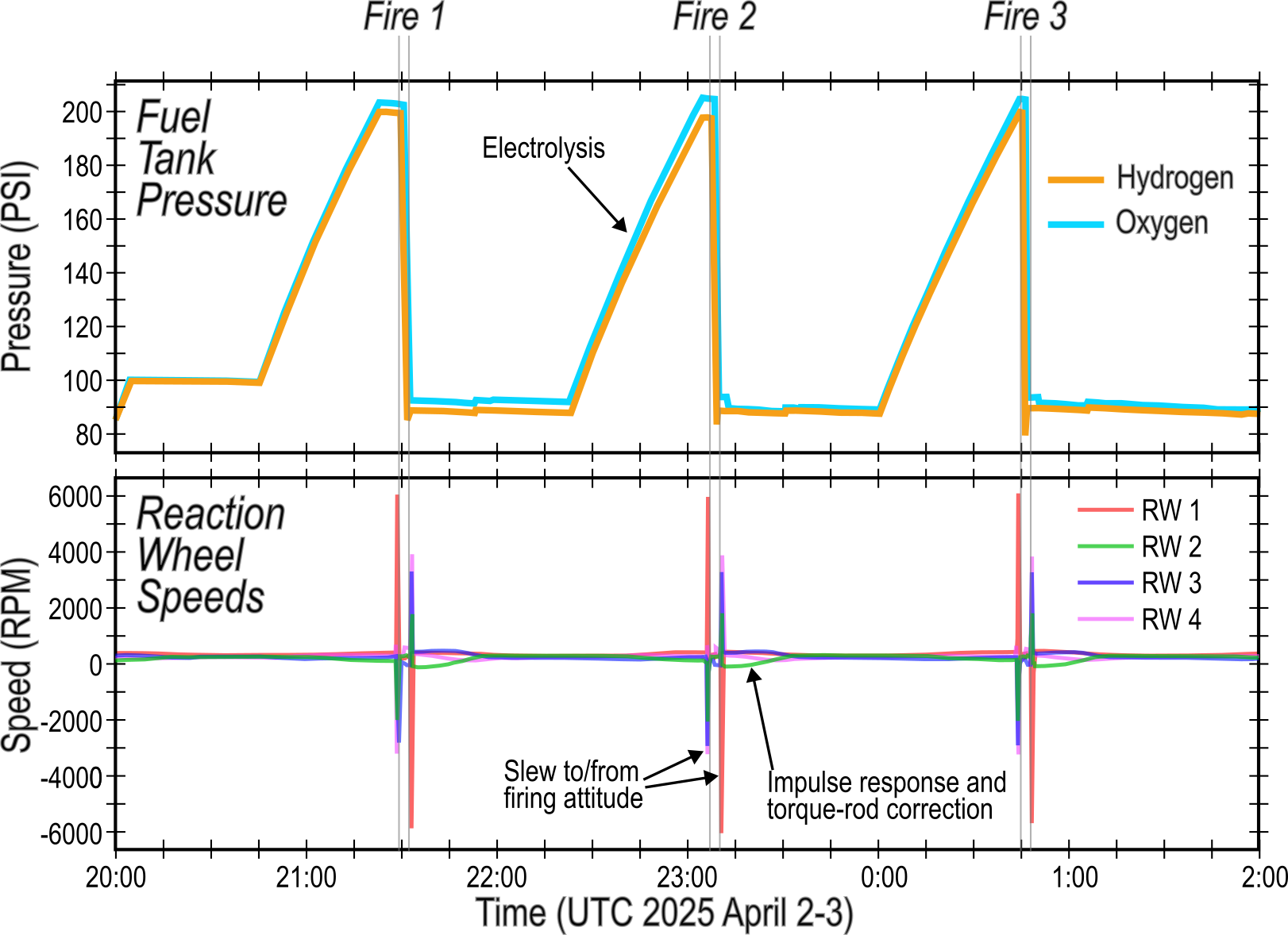 Between 2025 April 2 and 2025 April 3, the WFI-2 spacecraft successfully "hot-fired" its onboard Hydros rocket engine three times in a row, unattended – a milestone for PUNCH. Top plot showspressure in the tanks as water is electrolyzed to make fuel (which is then burned). Reaction wheel speeds show repeatable torque impulses from each thruster firing.