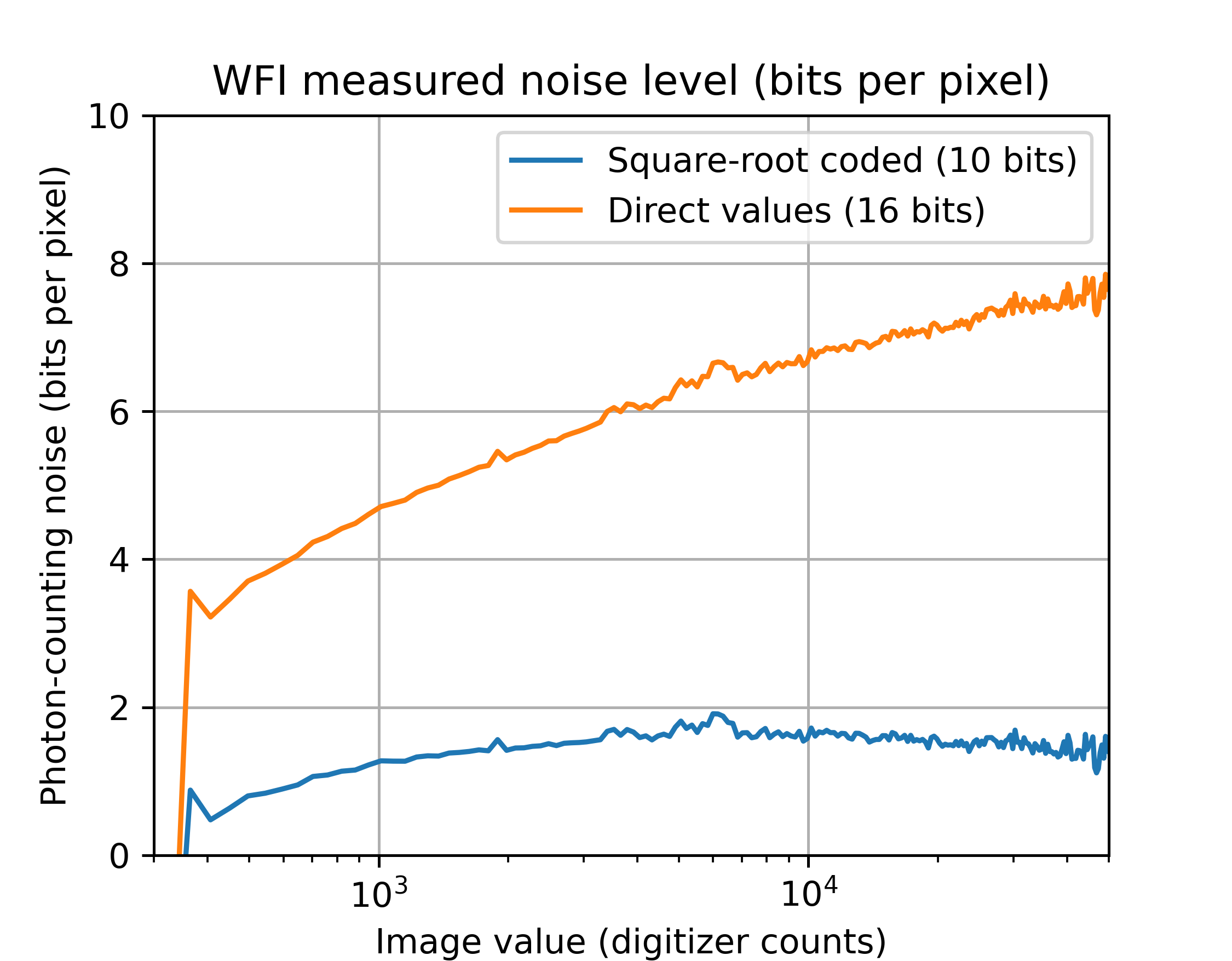 Part of commissioning PUNCH was tuning the number of bits to preserve. We want just over one bit worth of noise, to “dither” the data, smoothing out the digital transitions and making them better approximate a smooth measurement. The theoretical ideal scaling factor reduces the WFI images from 16 bits (linear) to 10 bits (square rooted), preserving just 1,000 unique values for each pixel over a dynamic range of about 65,000 values. We adjusted the scaling range between 9.5 and 11.5 bits on-orbit, and analyzed the statistics of the images. We found that 10 bits is indeed exactly right for WFI, preserving dithering across the whole dynamic range, while reducing the image size from 8 MB (raw) or 3 MB (JPEG-LS) to just 1.2 MB (coded & compressed).