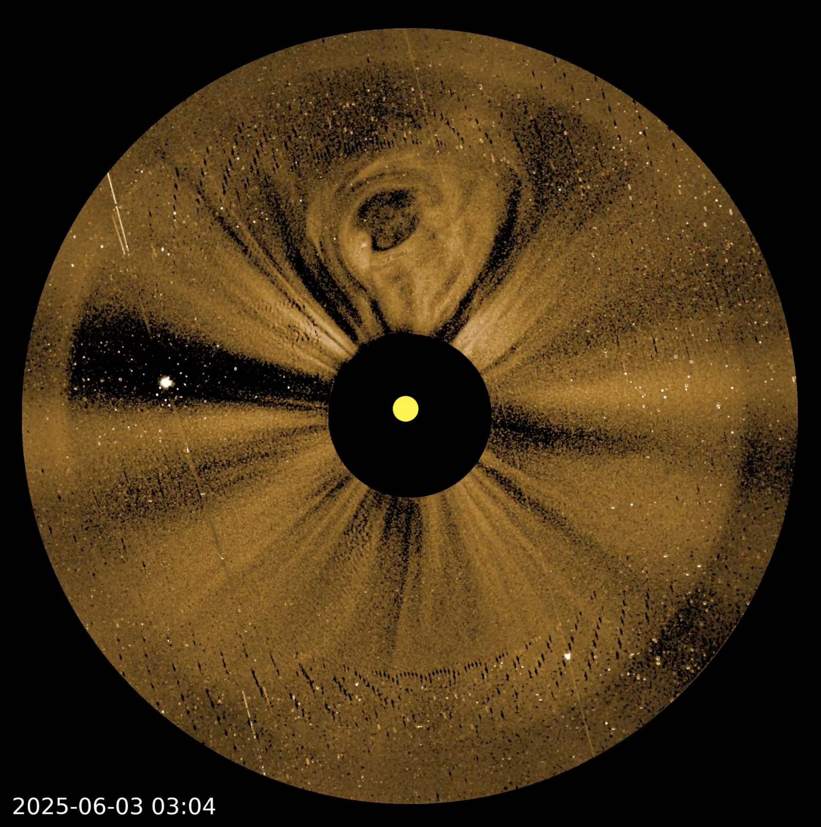 The PUNCH/NFI coronagraph revealed beautiful, detailed structure in a CME departing the Sun on 6/3/2025. Preliminary images like this one demonstrate that the instrument is working well and the Science Operations Center is making progress toward full, routine, polarized imaging from this challenging instrument, as PUNCH enters science operations.