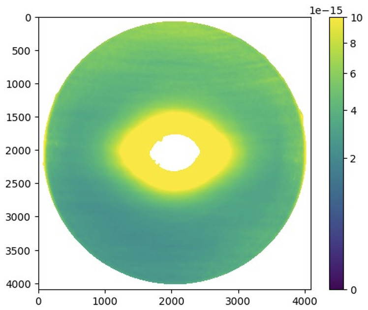 There’s one issue: see that bright yellow “doughnut” in the middle of the figure? That is the part of the image that is dominated by photon counting noise: quantum uncertainty in the amount of energy that hit the detector at that location. For most of the figure, the brightness of the figure is proportional to the sensitivity of the camera, but photon counting noise isn’t. It varies more like the square root of the sensitivity of the camera. So we can’t use this method to measure the flat field too close to the Sun. But it works like a champ over most of our field of view.