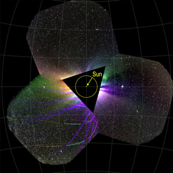 While testing in-development data visualization tools, Science Operations Center scientist Ritesh Patel noticed this colorful display in preliminary data from the PUNCH constellation. Hue represents direction of polarization, and saturation represents degree of polarization. The extended solar corona is visible against the starfield, with the constellations Libra and Scorpio visible near the Sun at the center of the field of view. At this moment, one of the WFI spacecraft suffered a collision with a micrometeoroid, launching tiny fragments of the spacecraft itself outward through the instrument’s field of view. The fragments can be seen arcing across the field, leaving brilliantly colored tracks as they were captured through the three polarizers in turn.