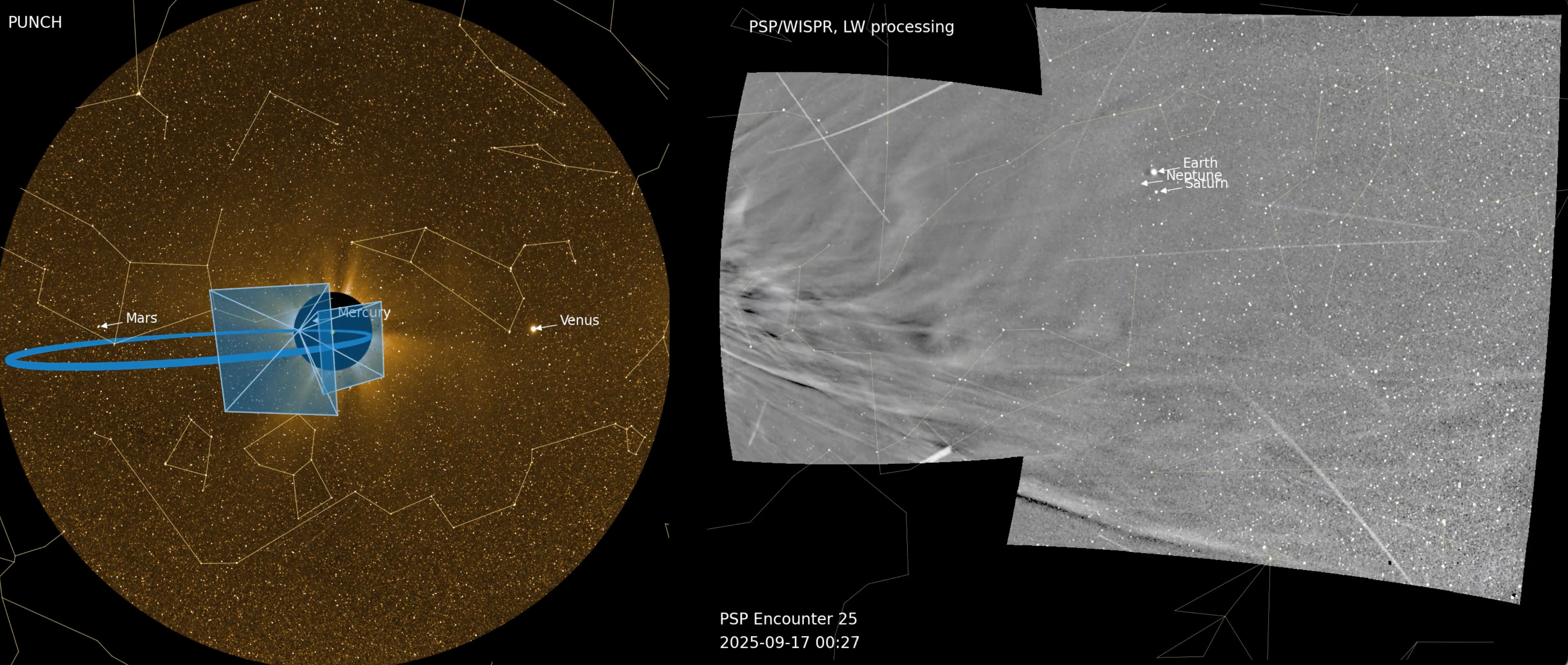 On 16 September 2025, as PSP whipped around the Sun after its perihelion pass, Earth itself, including PUNCH, became visible in the WISPR images. The celestial “staring contest”, across a full astronomical unit of distance, lasts for about a week as PSP gradually rotates and eventually drops its gaze.
