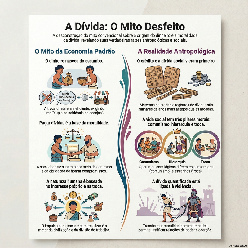 A função ideológica deste mito é crucial: ele não é um simples erro histórico, mas uma ficção fundacional necessária para criar a visão calculista e egoísta da natureza humana — o homo economicus — sobre a qual toda a teoria econômica subsequente é construída. Ele nos ensina que, em nosso estado natural, somos seres que trocam, comparam e buscam a máxima vantagem. Este pressuposto deliberadamente ignora a primazia do crédito e do que Graeber chama de "comunismo de base" na fundação da vida social, projetando a lógica de mercado sobre toda a história humana para torná-la uma condição natural e eterna, em vez de uma imposição recente e violenta.