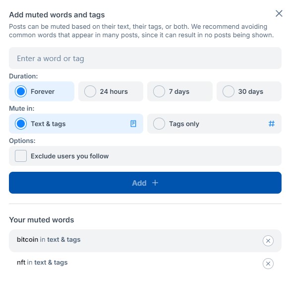 Simply a list of words you wish to filter out of your feed based on text and tags or just tags forever or a period of time.