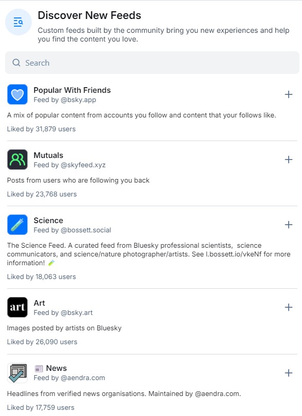 Custom Feeds are built by Bluesky users on outside servers and are then published in the bluesky feeds page. Use the Discover New Feeds search bar or scroll down through popular feeds. Click the + symbol to add to your feeds.