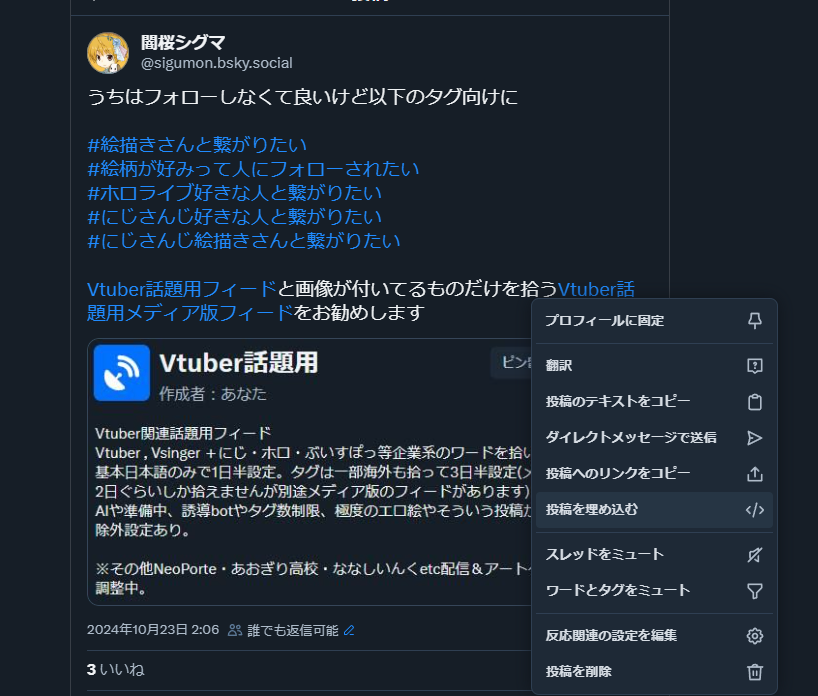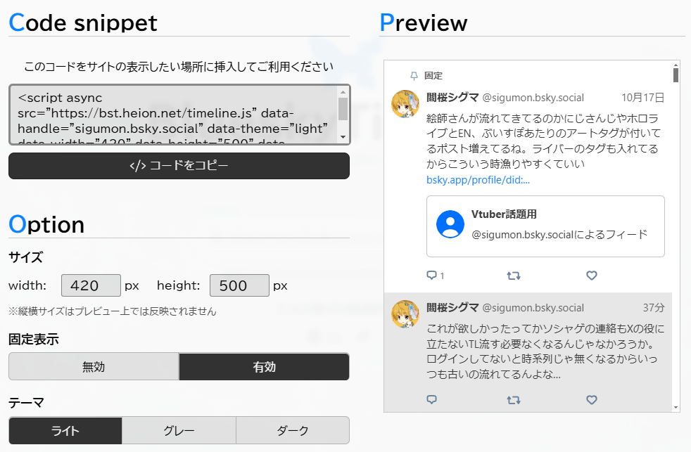 ハンドル名を入力するとこんな感じのメニュー。自分のサイトにBlueskyのタイムラインというか、プロフィールのフィードを埋め込むには