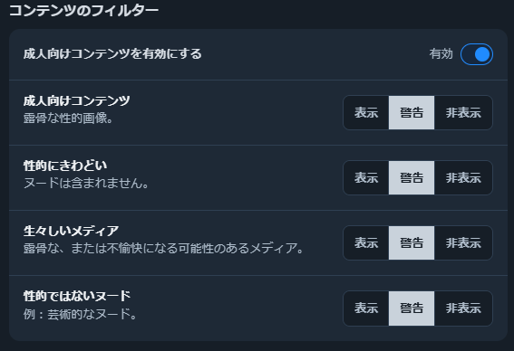 ここではモデレーションで見たい範囲を「表示・警告・非表示」で選べるようになっています。