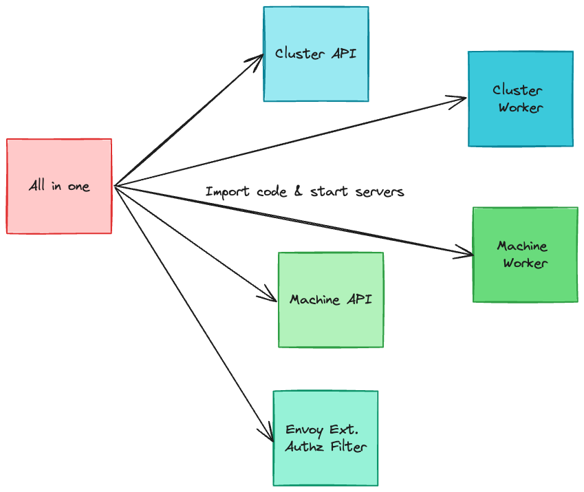 So I created a new Go module, which is just a main file importing all the other modules, and starting all the servers. It required a bit of code refactoring, to make sure that all Go modules properly exposed their servers - instead of an ugly main function. And it's a good practice anyway.
