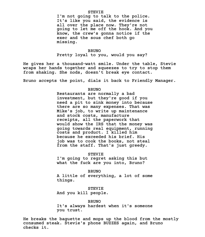 No, my gripe is pretty blue collar. Even The Menu is a satire on eating culture rather than on kitchen culture. There's a reason Bruno, the owner of my fictional Fausta, is actually an exceptionally courteous and considerate hands-off kind of boss - because he's also a killer. And if you asked the average cook today if they'd rather work for a teachable-moment-dispensing emotionally insecure nag who flies off the handle, or if they'd rather work for an excellent, reasonable boss who happens to murder people occassionaly, you'd get some hesitation before getting your answer.